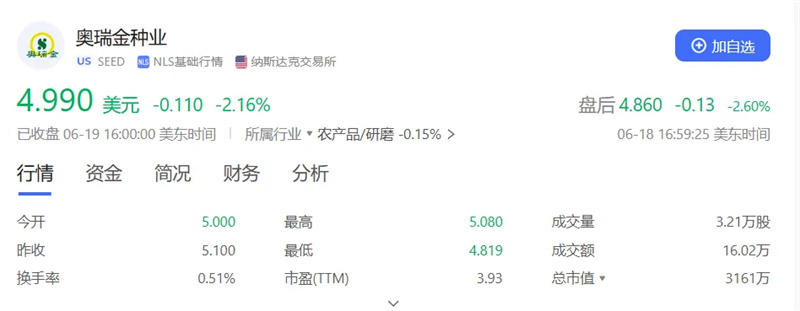 15、奧瑞金種業(美股)北京奧瑞金種業股份有限公司2005年在美國納斯達克交易所上市,目前市值3161萬美元。