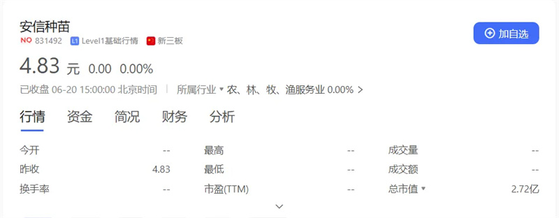18、安信種苗[831492]山東安信種苗股份有限公司2014年12月掛牌新三板,目前市值2.72億元。公司主營業務為種苗繁育等。
