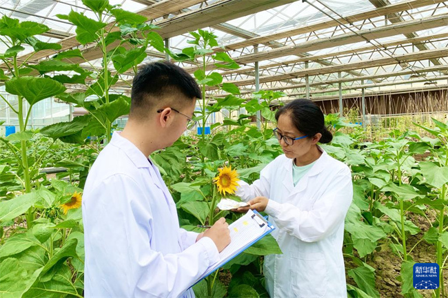 6月14日,在內蒙古巴彥淖爾市五原縣,三瑞農科向日葵技術研究院科研人員在觀察向日葵抗病害情況。新華社記者 李云平 攝