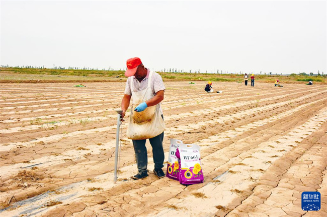 6月6日,內蒙古巴彥淖爾市臨河區狼山鎮農戶在種植向日葵。新華社記者 李云平 攝