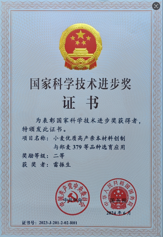 6月24日,2023年度國家科學技術獎在京揭曉。我院雷振生研究員主持完成的“小麥優質高產親本材料創制與鄭麥379等品種選育應用”項目,榮獲國家科學技術進步獎二等獎。