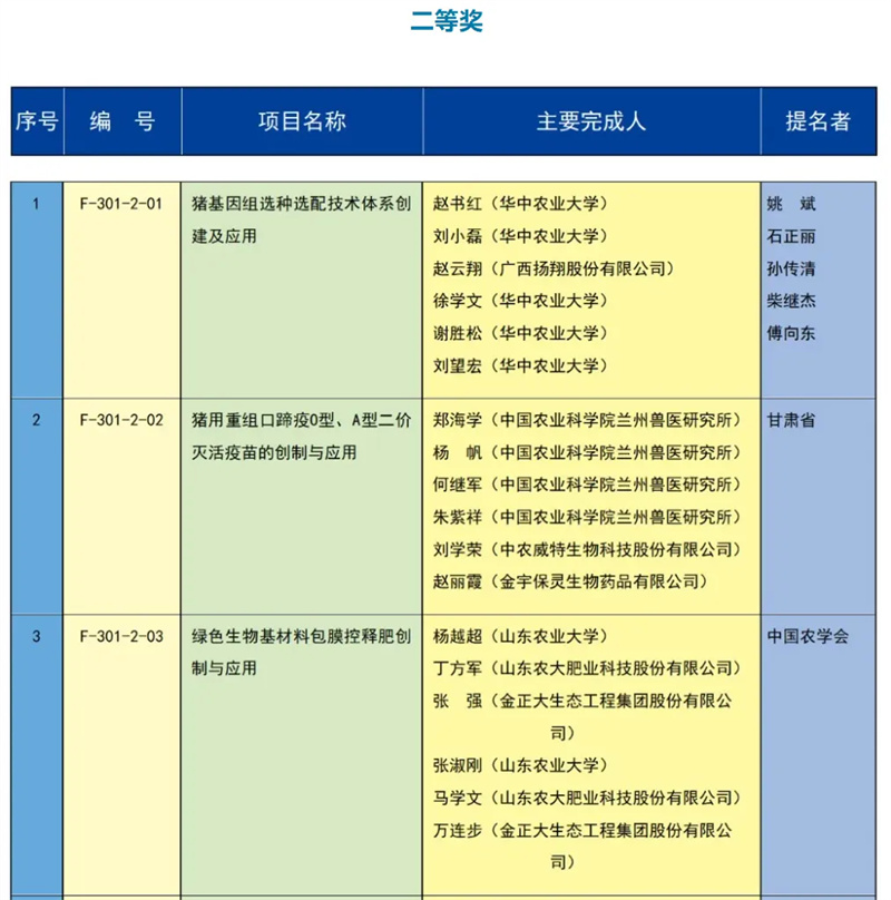 畜禽種業有豬基因組選種選配技術體系創建及應用、豬用重組口蹄疫O型、A型二價滅活疫苗的創制與應用獲得2023年度國家自然科學獎二等獎,肉鴨高效育種技術與新品種培育及產業化獲得2023年度國家科技進步獎二等獎。