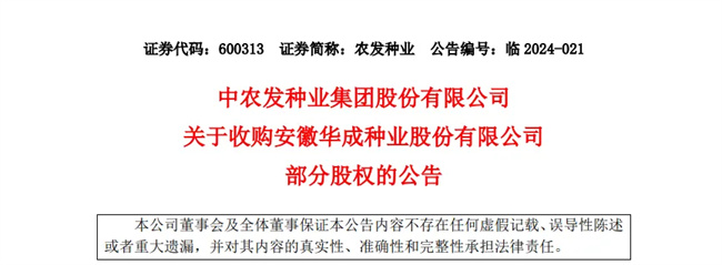 6月24日,中農發種業集團股份有限公司(下稱“中農發種業”)發布公告,擬以現金2433.34萬元收購現代種業發展基金有限公司所持有的安徽華成種業股份有限公司34.74%股權。
