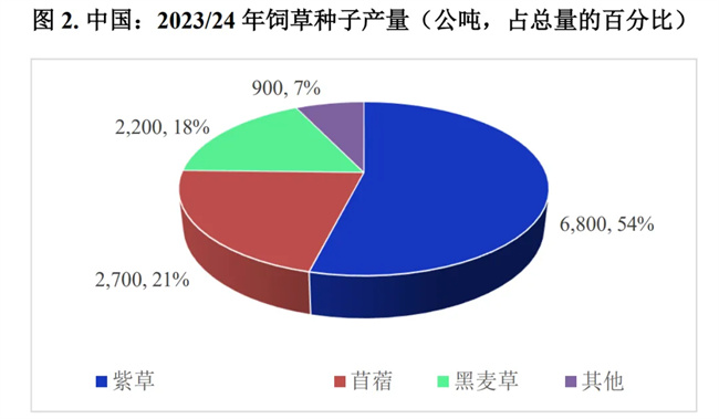 根據2023年10月國家林業和草原局發布的《2024年中國草種子供需分析報告》(中文鏈接),2023/24市場年度的草種子產量預計為2.91萬噸,收獲面積為3.33萬公頃。與2022/23市場年度相比,分別增長了73%和15%,當時由于極端干旱和政府保護耕地用于糧食生產的不利天氣條件,產量下降了52%,從2021/22市場年度的3.48萬噸降至1.68萬噸。青海省是中國最大的草種子生產地,占2023/24市場年度總草種子產量的44%,其次是甘肅省,占26%,陜西省和寧夏回族自治區各占9%。生態草種子產量預計為1.65萬噸,飼料草種子產量為1.26萬噸。