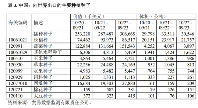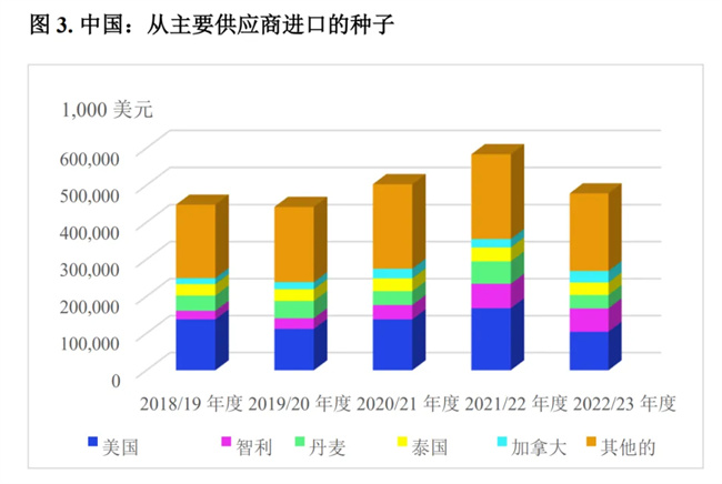 根據 2024 年 3 月農業農村部(MARA)發布的報告,以及 2023 年 9 月由農業農村部國家農業技術推廣服務中心發布的《2023-2024年中國主要農作物種子生產供需》報告,2023/24 市場年度的主要農作物種子生產有所增加,導致種子供應過剩,價格穩定或下降。