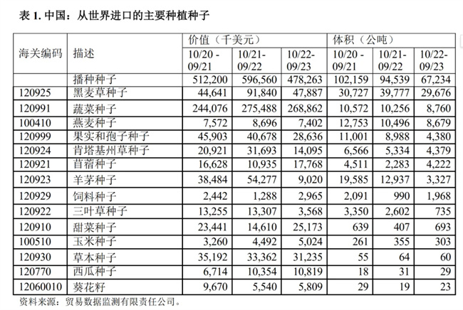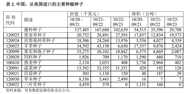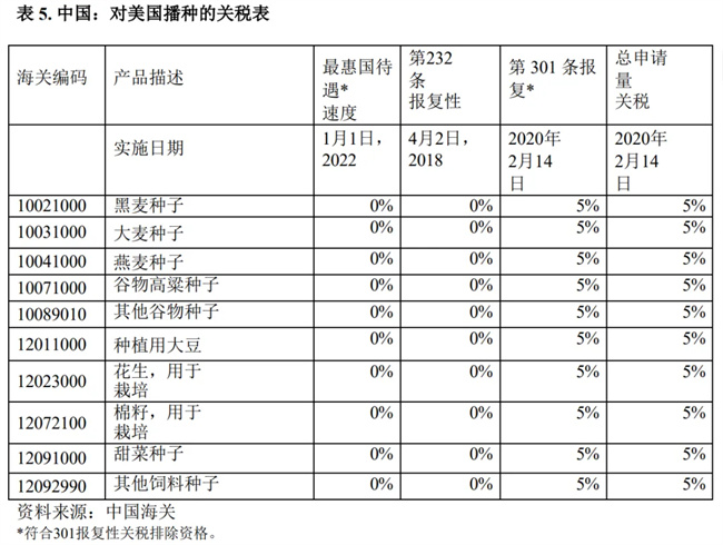 中國于2019年9月1日對種植種子征收報復性關稅。不過,該關稅并不適用于大多數草籽, 按價值計算,這些草籽合計占2022/23年度美國種子進口總額的95%以上。對于加征關稅 的種子,進口商可以申請關稅排除。有關進口商申請特定產品關稅排除程序的信息,請 參閱 USDA GAIN 報告編號:CH2020-0017.