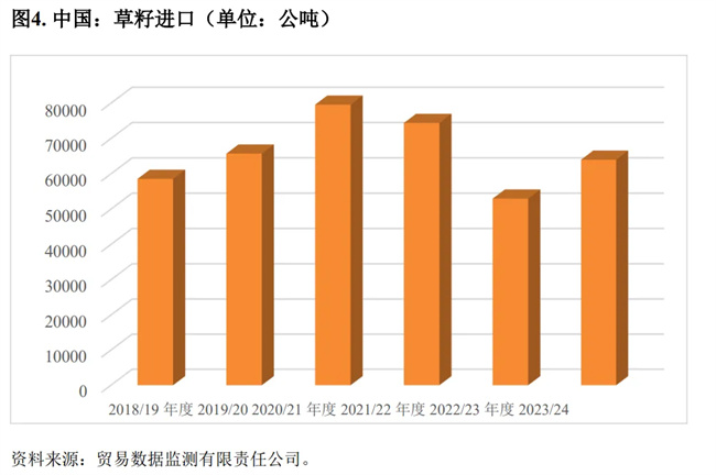 預計2023/24 年的草籽(苜蓿、黑麥、羊茅、三葉草、燕麥和肯塔基州)進口量2022/23 年的低基線增長20%,達到 64,000噸(見下圖4)。根據中國海關數據,2023/24年前六個月,草籽進口量同比增長96%。然而,行業聯系人表示,草籽進口的反彈不太可能延續到2023/24 年下半年,因為前六個月的產量增加是由庫存減少推動的,但庫存已恢復,而不是總體水平。需求增長。行業消息人士稱,由于中國經濟放緩,草籽的整體需求,特別是用于綠化的草坪種子的需求仍然疲軟。房地產市場低迷和政府預算緊張減少了需求為城市綠化提供草種。聯系人報告稱,燕麥草種子和一些黑麥草種子等飼用草種子的需 求高于綠化禾草種子。