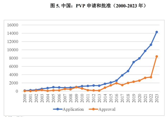 自 2017 年以來,中國每年的植物新品種申請量一直是國際植物新品種保護聯盟(UPOV)成員國中最高的。根據 2024 年 2 月的一份報告馬拉報告, 截至 2023 年底,中國共收到 近 77,000 份 PVP 申請,并批準了 30,000 多項批準。僅 2023 年,PVP 辦公室就收到了 14,278 份申請,批準了 8,385 份,較 2022 年分別增長了 27% 和 148%。