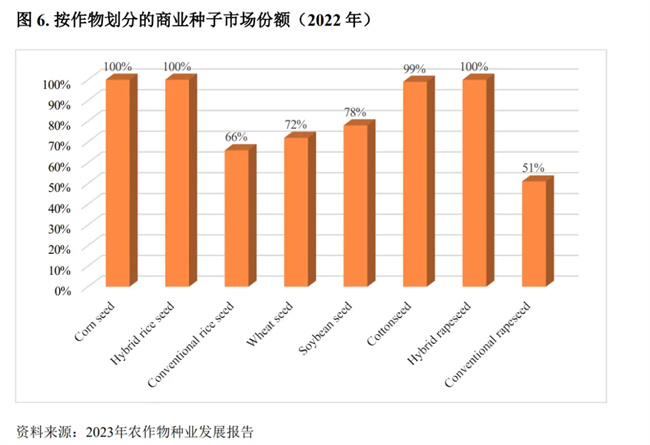 中國是僅次于美國的世界第二大種子市場,每年種植 12 MMT 種子,價值 185 億美元。根據農業農村部《2023 年農作物種子產業發展報告》,七種主要農作物(玉米、水稻、 小麥、大豆、棉花、馬鈴薯和油菜籽)的種子用量約為 10 MMT,價值 140 億美元。商業種 子占上述七種主要作物種子使用量的 72%,其余種子來自農場以前收獲的種子。