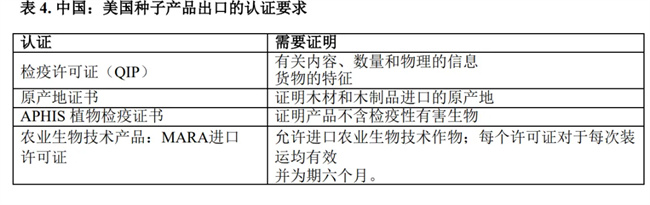 種子產品貿易應附有相關主管部門頒發的所需證書/許可證。下表 4 提供了美國種子出口 到中國的認證要求。欲了解更多信息,請參閱 GAIN 報告 2024 年 FAIRS 出口證書報告 年度報告。