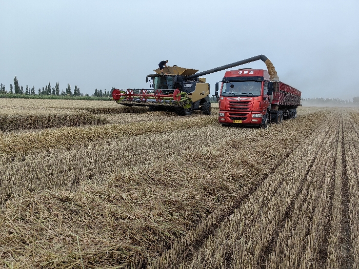 6月26日(ri),在(zai)一(yi)師一(yi)團(tuan)(tuan)冬小麥(mai)測(ce)產田里(li),聯(lian)合收(shou)割機將麥(mai)粒裝(zhuang)車。兵團(tuan)(tuan)農業農村局淮(huai)河(he)攝