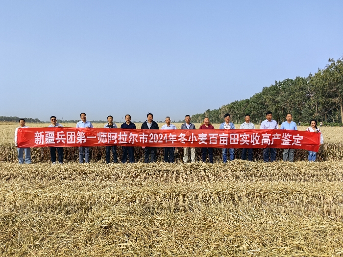 2024年6月25-26日,經新疆生產建設兵團農業農村局申請,農業農村部組織中國農業大學、西北農林科技大學、新疆農業科學院、新疆農墾科學院、兵團農業技術推廣總站等單位相關專家組成專家組,根據農業農村部《全國糧食高產創建測產驗收辦法(試行)》,對第一師創建的冬小麥百畝田、千畝方、萬畝片高產示范田進行實打實收測產,平均單產分別達到755.6公斤/畝、731.3公斤/畝、703.8公斤/畝,創新疆南疆片小麥單產最高紀錄。