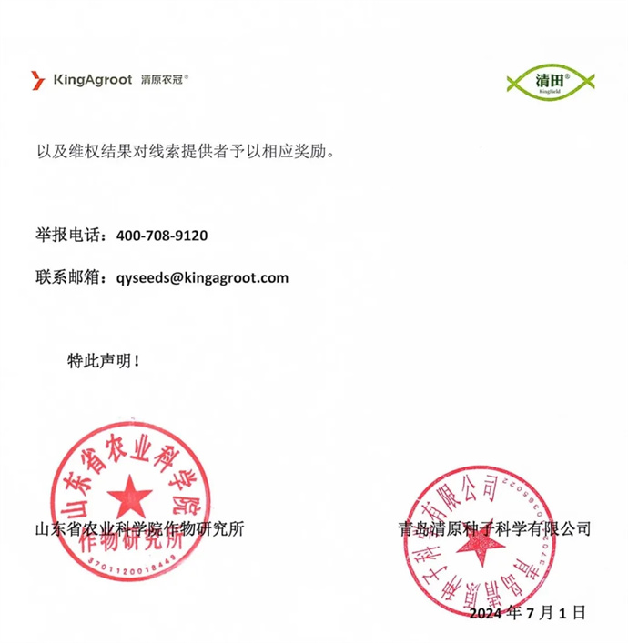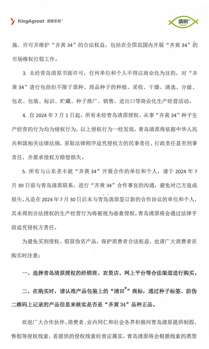 清原種子科學關于大豆品種“齊黃34”的維權聲明