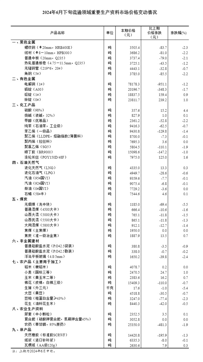國家統計局數據顯示,據對全國流通領域9大類50種重要生產資料市場價格的監測顯示,2024年6月下旬與6月中旬相比,12種產品價格上漲,33種下降,5種持平。
