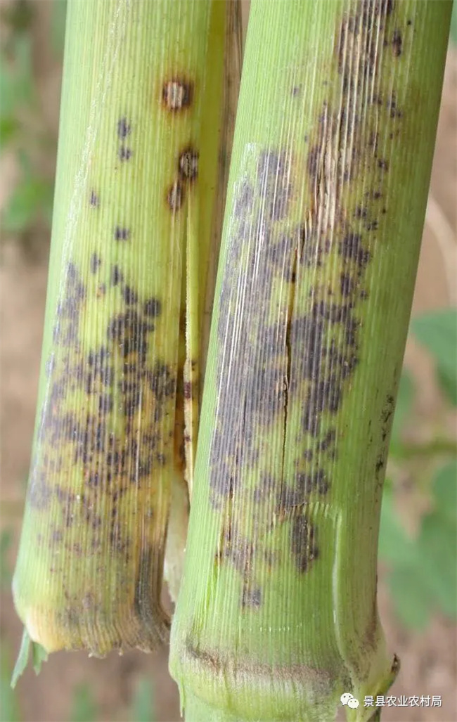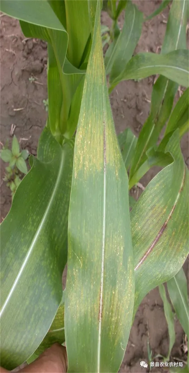玉米褐斑病也是我國夏玉米區常發病害,玉米褐斑病通常發生在玉米葉片、葉鞘及莖稈,一般先在頂部葉片的尖端發生,以葉和葉鞘交接處病斑最多,常密集成行,發病初期在玉米葉片上出現很多黃色小斑點,病斑為圓形或橢圓形到線形,隆起附近的葉組織常呈紅色,小病斑常匯集在一起,嚴重時葉片上出現幾段甚至全部布滿病斑,在葉鞘和葉脈上出現較大的褐色斑點;后期,葉片和莖上會出現無規則的大斑點,玉米葉面組織壞死并裂開,失去光合作用功能,嚴重影響玉米產量。