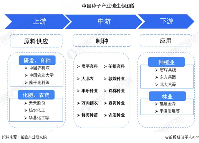 生物育種技術位于產業鏈上游環節。前瞻產業研究院通過對種子產業進行剖析發現:行業上游種子研發機構包括中國農業大學、中國農業科學院、隆平高科等;中游種子生產企業主要包括隆平高科、登海種業、豐樂種業、萬向德農、荃銀高科等;下游種植業企業主要包括東方集團、宏輝果蔬等,林業企業包括福建金森、平潭發展等。