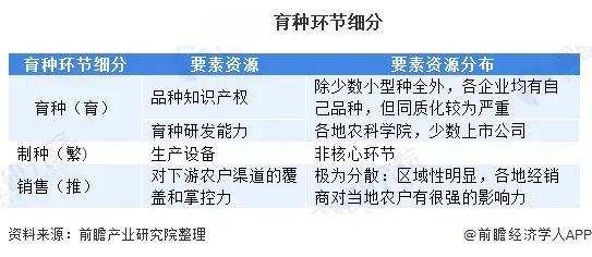 種子產業鏈可以具體細分為育種、制種以及銷售,即育、繁、推三個環節。從前的計劃經濟體制使我國種業的三個環節非常獨立:由科研院所負責育種,由種子企業進行制種,最后由各地種子站進行銷售。但自2000年種子法出臺后,上述情況稍有改變,產業分工不再那么明確。其中,育種環節為產業鏈核心,品種的知識產權以及育種研發能力為環節核心要素。此外,銷售環節的重要性不可小覷。由于種業銷售終端的區域分散和種植戶的信息不對稱,經銷商的下游掌控力和議價能力比一般行業要強得多。因而,從產業鏈價值分布來看,銷售渠道環節要分去近50%的利潤。