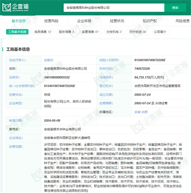 據企查貓數據顯示,荃銀高科在新疆、四川、遼寧、湖北、廣西、安徽、江西、上海均布局有子公司,其中,安徽是公司的重點布局地,共擁有12家子公司,主要涉及種子的技術研發和生產經營業務。