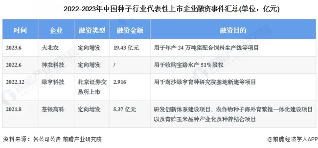根據代表性上市企業融資公告,種子行業的上市公司融資手段主要有定向增發。整體來看,中國種子行業上市企業的融資主要用于建設新項目。2022-2023年種子行業代表性企業主要的融資事件如下: