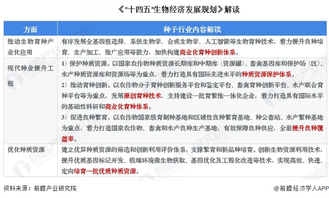 國家高度重視現代農作物種業發展,從“十二五”規劃到“十四五”規劃,我國均堅持大力發展種業發展,推進生物育創新和產業化應用,建設育種基地,推動種業企業提升國際競爭力。根據國家發改委《“十四五”生物經濟發展規劃》,提出發展現代種業等7項建設工程,推動生物育種,完善種質資源保護體系建設,加快構建商業化育種創新體系。政策主要內容如下: