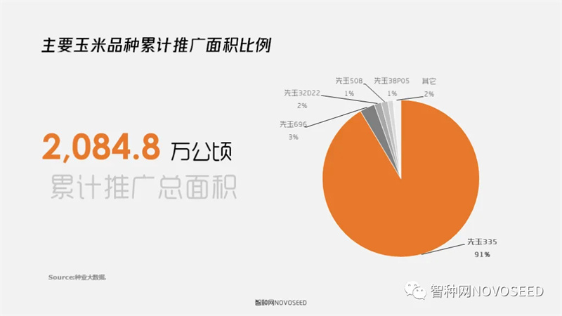 緊隨其后的(de)(de)先(xian)(xian)(xian)玉(yu)(yu)(yu)(yu) 696 和 32D22,分別(bie)為(wei)66.3 萬和29.7 萬hm2,只(zhi)占總面積(ji)(ji)的(de)(de) 3.10% 和 1.44%。排在(zai)第 4 位的(de)(de)38P05 推廣面積(ji)(ji)為(wei) 22.5 萬hm2,占總面積(ji)(ji)的(de)(de) 1.10%。此(ci)外(wai),先(xian)(xian)(xian)玉(yu)(yu)(yu)(yu)420 和先(xian)(xian)(xian)玉(yu)(yu)(yu)(yu)698 的(de)(de)推廣面積(ji)(ji)也(ye)都(dou)超過了6.7 萬hm2。雖然先(xian)(xian)(xian)鋒公司(si)(si)也(ye)有(you)(you)一批優良品種推廣面積(ji)(ji)在(zai) 6.7 萬hm2以上,但是(shi)與(yu)先(xian)(xian)(xian)玉(yu)(yu)(yu)(yu)335 相比還是(shi)有(you)(you)很大的(de)(de)差距,說明先(xian)(xian)(xian)鋒公司(si)(si)的(de)(de)其他品種相較于先(xian)(xian)(xian)玉(yu)(yu)(yu)(yu)335 沒有(you)(you)絕對的(de)(de)優勢,表明先(xian)(xian)(xian)玉(yu)(yu)(yu)(yu)335 對先(xian)(xian)(xian)鋒公司(si)(si)的(de)(de)玉(yu)(yu)(yu)(yu)米(mi)推廣有(you)(you)著舉(ju)足(zu)輕重的(de)(de)地(di)位。