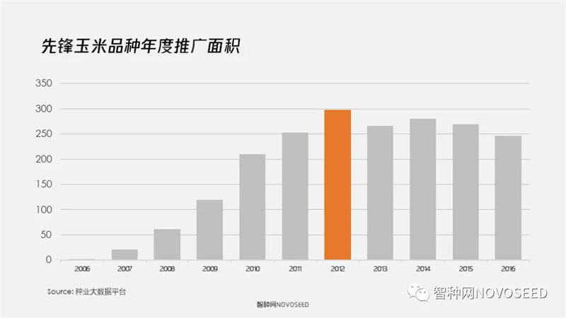 2006 年(nian)先(xian)鋒公司的(de)玉米(mi)品種種植(zhi)面積為(wei) 1.7 萬(wan)hm2,僅占全(quan)國玉米(mi)種植(zhi)面積的(de) 0.11%。但從 2007 年(nian)開始,其品種種植(zhi)面積每年(nian)都(dou)以幾十萬(wan)甚至(zhi)上百萬(wan)平方公頃(qing)的(de)速度快(kuai)速增長,在 2012 年(nian)達到(dao)了歷史最高 298.2 萬(wan)hm2,占當年(nian)全(quan)國玉米(mi)面積的(de) 8.51%,隨后的(de) 3 年(nian)內一直保持在 266.7 萬(wan)hm2以上,2016 年(nian)面積為(wei) 246.5 萬(wan)hm2(圖5)。