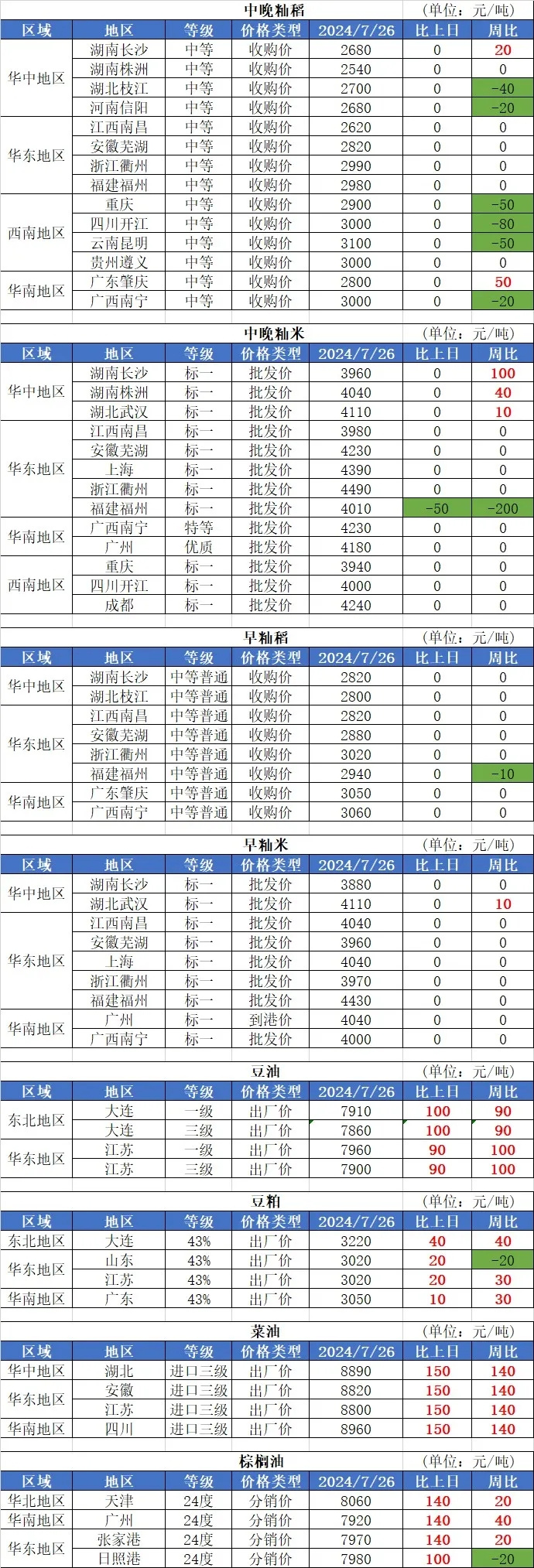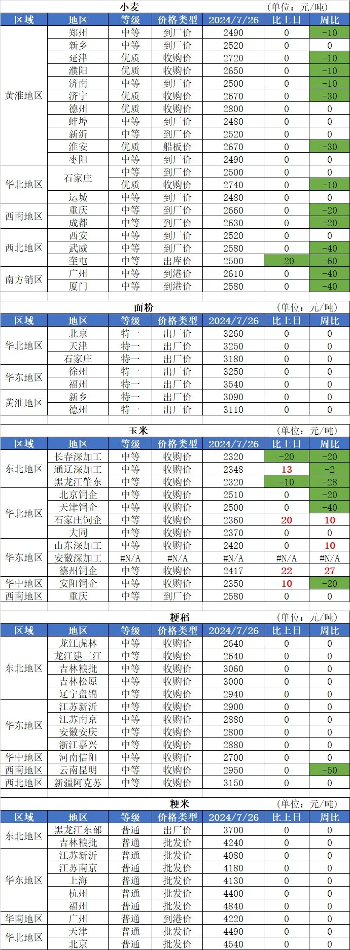 2、7月26日華北部分深加工玉米收購價格漲跌互現,其中河北廣玉玉米收購價格2370元/噸,山東成武大地玉米收2294元/噸,均較昨日下跌10元/噸;山東保齡寶玉米收購價格保2406元/噸,較昨日上漲10元/噸。