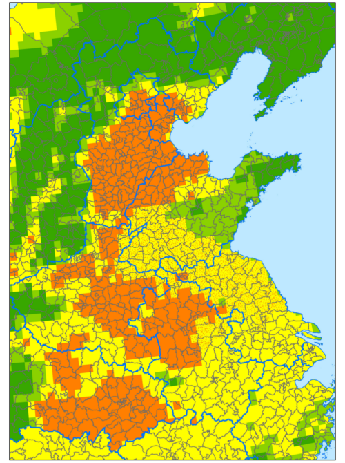 受近期第3號臺風“格美”北上影響,玉米南(nan)方(fang)(fang)銹病(bing)菌源(yuan)(yuan)可能(neng)傳播擴散(san)到黃淮海地區(qu),且(qie)臺風(feng)(feng)帶(dai)來的(de)豐沛(pei)雨水(shui)和較大幅度降溫,將創造適(shi)溫、高(gao)(gao)濕的(de)氣(qi)象條件,十分(fen)有利于南(nan)方(fang)(fang)銹病(bing)孢子的(de)沉降、侵(qin)染和病(bing)害的(de)暴(bao)發(fa)流行(xing)。根據(ju)專家(jia)會商,綜合(he)分(fen)析菌源(yuan)(yuan)、品種、臺風(feng)(feng)北(bei)(bei)上(shang)、天氣(qi)和耕作制(zhi)度等影響因素(su),預計今年玉(yu)(yu)米(mi)南(nan)方(fang)(fang)銹病(bing)在(zai)黃淮海玉(yu)(yu)米(mi)主產(chan)區(qu)偏重至大發(fa)生(sheng)(sheng),對玉(yu)(yu)米(mi)生(sheng)(sheng)產(chan)安全構成較大威脅,全國發(fa)生(sheng)(sheng)面積8000萬畝,發(fa)生(sheng)(sheng)流行(xing)盛期(qi)為8月中(zhong)旬至9月下(xia)旬。根據(ju)模型預測,未來2—3周,河(he)(he)南(nan)大部(bu)(bu)(bu),江(jiang)西(xi)、湖(hu)南(nan)和湖(hu)北(bei)(bei)局部(bu)(bu)(bu),浙(zhe)江(jiang)、安徽和江(jiang)蘇北(bei)(bei)部(bu)(bu)(bu),山東西(xi)部(bu)(bu)(bu),河(he)(he)北(bei)(bei)、北(bei)(bei)京、天津(jin)玉(yu)(yu)米(mi)南(nan)方(fang)(fang)銹病(bing)暴(bao)發(fa)流行(xing)風(feng)(feng)險較高(gao)(gao)(見(jian)圖1)。