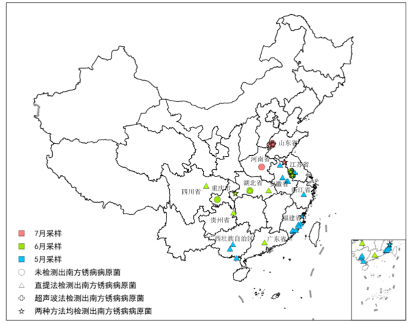 前期,我(wo)國福建等南(nan)(nan)方(fang)玉(yu)米產區南(nan)(nan)方(fang)銹病(bing)(bing)已普遍(bian)發生,5月(yue)(yue)底至7月(yue)(yue)中旬檢(jian)(jian)測來自福建漳(zhang)州(zhou)、福州(zhou)、廈門、泉(quan)州(zhou)、莆田等市(shi)的9個縣(xian)(區)共(gong)184份(fen)疑(yi)似樣品,均(jun)鑒(jian)定(ding)為玉(yu)米南(nan)(nan)方(fang)銹病(bing)(bing),檢(jian)(jian)出率100%。同時,5月(yue)(yue)18日—7月(yue)(yue)20日開展更大(da)范(fan)圍的玉(yu)米葉片(pian)采(cai)樣和分(fen)子檢(jian)(jian)測,結果顯示,南(nan)(nan)方(fang)、長江中下游、黃(huang)淮海地(di)區53份(fen)玉(yu)米葉片(pian)中37份(fen)含有南(nan)(nan)方(fang)銹病(bing)(bing)病(bing)(bing)菌(jun),占比達69.8%,存在大(da)范(fan)圍流行的菌(jun)源條件(見圖2)。截至7月(yue)(yue)24日,河南(nan)(nan)省南(nan)(nan)陽(yang)市(shi)鎮平縣(xian)、周(zhou)口市(shi)淮陽(yang)區、長葛(ge)市(shi)、許(xu)昌市(shi)魏都區、尉(wei)氏縣(xian)等地(di)疑(yi)似病(bing)(bing)葉,經病(bing)(bing)原PCR檢(jian)(jian)測確(que)認為南(nan)(nan)方(fang)銹病(bing)(bing),目(mu)前為初期單個病(bing)(bing)斑,發生時間早于去年同期、見病(bing)(bing)點數多于去年同期。