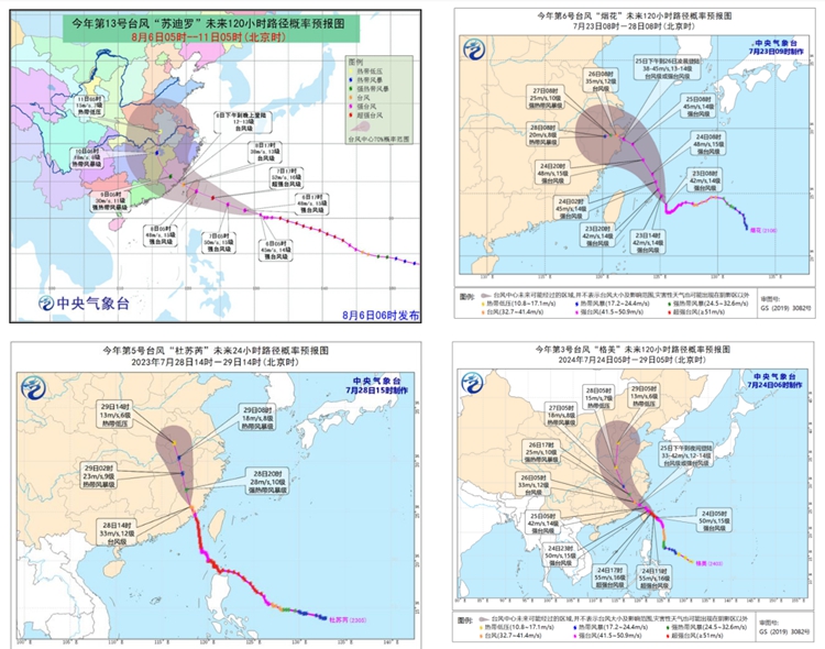 圖(tu)3 2024年(nian)臺(tai)風“格美”與(yu)2015年(nian)臺(tai)風“蘇(su)迪羅”、2021年(nian)臺(tai)“煙(yan)花”、2023年(nian)臺(tai)風“杜蘇(su)芮”路徑對比