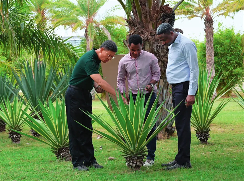 在三亞崖州灣科技城,非洲留學生跟隨中國熱帶農業科學院研究員易克賢(左一)在觀察劍麻育種材料長勢(2024 年 5 月 17 日攝) 黎多江攝 / 瞭望