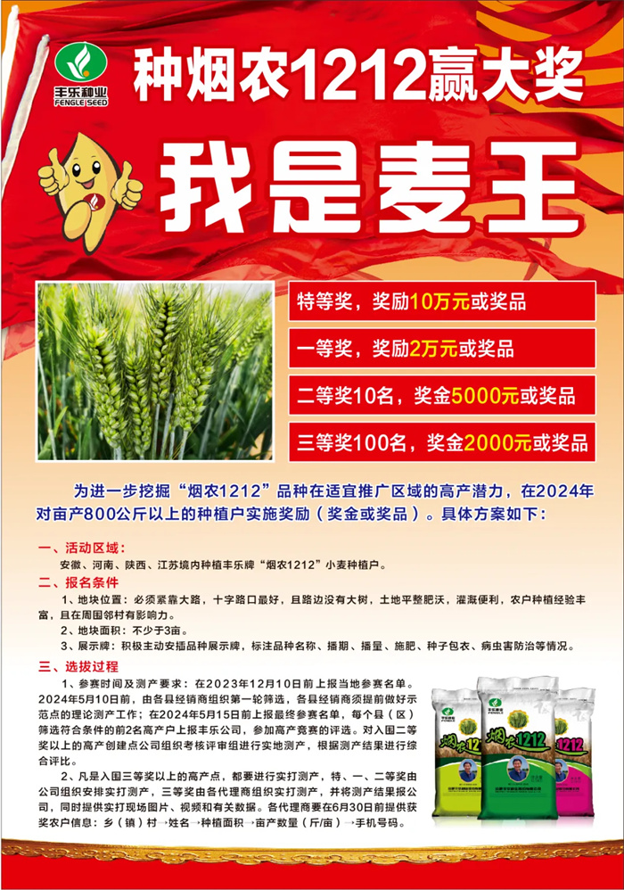 為積極響應國家鄉村振興戰略,推動農業科技進(jin)步,提(ti)升糧食生產(chan)效益(yi),豐樂種業(ye)于2023-2024年度開展了(le)“煙農(nong)1212”種植(zhi)戶高產(chan)創建麥王賽。本次活(huo)動旨(zhi)在激發更多(duo)的農(nong)民朋友加入(ru),挖掘“煙農(nong)1212”良種優(you)勢,良種良法配套,努力實(shi)現每畝(mu)多(duo)收200斤(jin)奮(fen)斗(dou)目標。