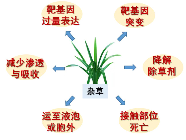 抗性雜草能減少除草劑向體內滲透和運輸,或通過主動運輸將除草劑轉移到“安全地點”(如液泡中)或細胞外,還能進化出“解毒”能力,將除草劑降解為低毒或無毒的物質。還有一些雜草,接觸過除草劑的葉片迅速枯萎死亡,使得除草劑無法轉移到其他部位,不影響整體生長。