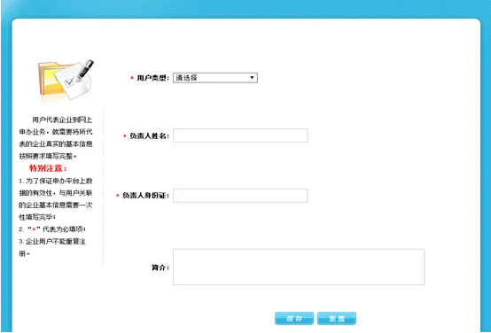 其中用戶類型選擇企業用戶或個人用戶,注冊信息全部為必填項,重置按鈕可以刷新本頁面至初始狀態,點擊注冊按鈕,完成注冊。
