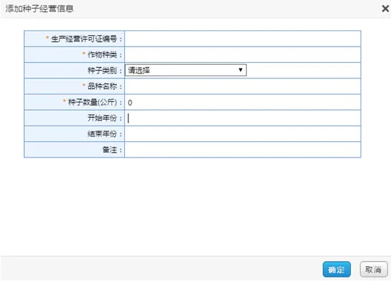 點擊【添加品種詳情】按鈕,填寫正確的生產經營許可證編號,填寫的種子類別、品種名稱、種子數量等相關信息,選擇上傳附件,點擊【確定】按鈕完成備案信息填寫。