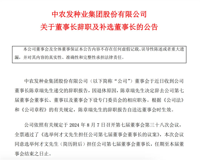 8月7日,中農發種業集團股份有限公司(以(yi)下簡稱“農(nong)發(fa)種業”)公(gong)告,因退休原因,陳章瑞決定辭(ci)去公(gong)司第七(qi)屆(jie)董事(shi)(shi)會(hui)董事(shi)(shi)長(chang)、董事(shi)(shi)等相應職務。公(gong)司董事(shi)(shi)會(hui)同意選舉何才(cai)文(wen)擔任(ren)公(gong)司第七(qi)屆(jie)董事(shi)(shi)會(hui)董事(shi)(shi)長(chang)。