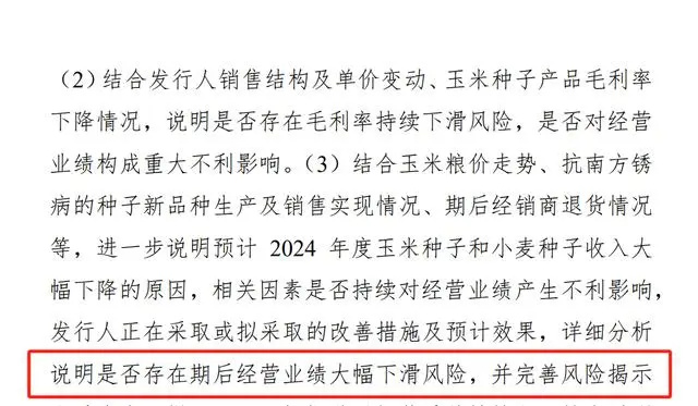 此外(wai),交易所要求公(gong)(gong)司結合銷售結構及單價變動、玉米種子產品毛利(li)率下(xia)(xia)降(jiang)情況(kuang),說明(ming)(ming)是(shi)(shi)(shi)(shi)否存(cun)在毛利(li)率持(chi)續(xu)下(xia)(xia)滑風(feng)險(xian),是(shi)(shi)(shi)(shi)否對經營(ying)業績構成(cheng)重大(da)不(bu)利(li)影響;進一(yi)步說明(ming)(ming)預(yu)計2024年(nian)玉米種子和小(xiao)麥種子收入大(da)幅下(xia)(xia)降(jiang)的(de)原因,相關因素是(shi)(shi)(shi)(shi)否持(chi)續(xu)對經營(ying)業績產生(sheng)不(bu)利(li)影響,公(gong)(gong)司正在采取(qu)或(huo)擬采取(qu)的(de)改善措施及預(yu)計效果,詳細(xi)分析(xi)說明(ming)(ming)是(shi)(shi)(shi)(shi)否存(cun)在期(qi)后經營(ying)業績大(da)幅下(xia)(xia)滑風(feng)險(xian);根據種子經營(ying)季(ji)節性情況(kuang),補充說明(ming)(ming)2023—2024年(nian)經營(ying)季(ji)、2024—2025年(nian)經營(ying)季(ji)有代表性的(de)截止日(ri),公(gong)(gong)司預(yu)收款、預(yu)定數量及是(shi)(shi)(shi)(shi)否同比下(xia)(xia)降(jiang),如(ru)是(shi)(shi)(shi)(shi),說明(ming)(ming)下(xia)(xia)降(jiang)原因,是(shi)(shi)(shi)(shi)否對持(chi)續(xu)經營(ying)能力構成(cheng)重大(da)不(bu)利(li)影響。