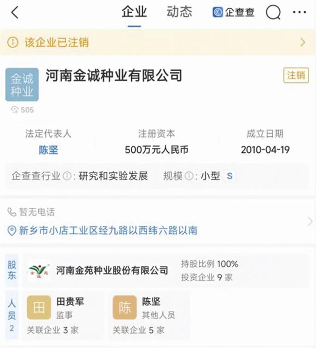 河(he)南金(jin)誠(cheng)種(zhong)業有限公(gong)司(下稱“河(he)南金(jin)誠(cheng)”)曾(ceng)是金(jin)苑種(zhong)業全資子(zi)公(gong)司,工商信息(xi)顯示于2010年4月成立,2011年3月注銷(xiao)。其注銷(xiao)時,公(gong)司持股100%,法定(ding)代表人(ren)為(wei)(wei)陳(chen)堅(jian),陳(chen)堅(jian)還登(deng)記為(wei)(wei)其他人(ren)員,監事則是田貴軍。