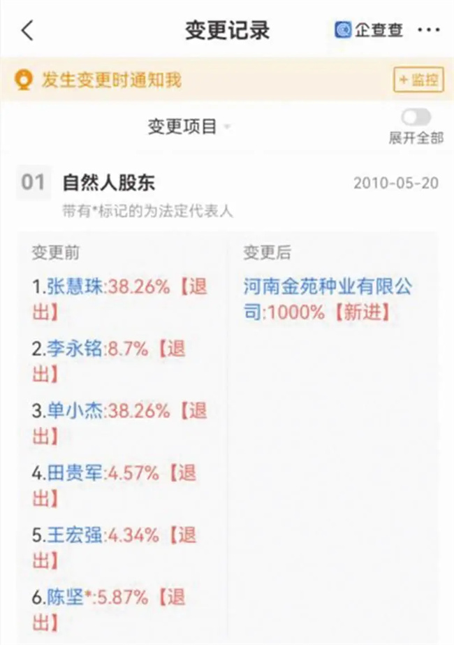不過,通過企查查查詢的(de)工(gong)商信(xin)息顯示,2010年5月20日,金(jin)苑種業(ye)才登(deng)記成(cheng)為河南金(jin)誠的(de)唯一股(gu)東(dong),此前的(de)6名自然人股(gu)東(dong)全部退出(chu)——他(ta)們是分(fen)別(bie)持(chi)(chi)(chi)股(gu)38.26%的(de)張慧(hui)珠、單小杰,持(chi)(chi)(chi)股(gu)8.7%的(de)李永銘,持(chi)(chi)(chi)股(gu)5.87%的(de)陳堅,持(chi)(chi)(chi)股(gu)4.57%的(de)田貴(gui)軍,持(chi)(chi)(chi)股(gu)4.34%的(de)王宏強。