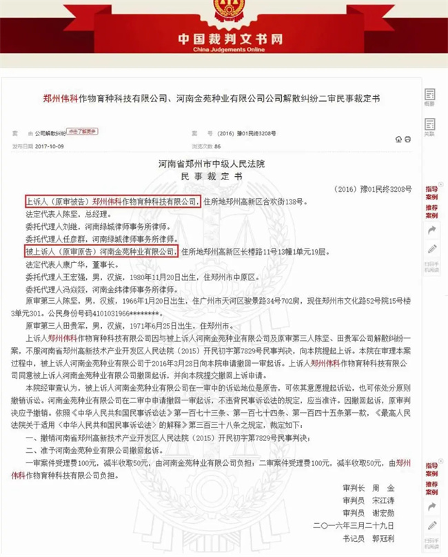 值得一提的是,鄭州(zhou)偉科與公(gong)司之間還(huan)曾存在訴訟糾(jiu)紛(fen),而且為(wei)公(gong)司解(jie)散糾(jiu)紛(fen)。中國裁判(pan)文書網(wang)顯示(shi),金苑種業前身金苑有(you)限曾因公(gong)司解(jie)散糾(jiu)紛(fen),起訴鄭州(zhou)偉科,第(di)三(san)人為(wei)陳堅、田貴(gui)軍,鄭州(zhou)偉科因不服一審判(pan)決提起上訴。