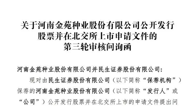 據(ju)悉,今年5月,金苑種(zhong)業披(pi)露關于公司(si)公開發(fa)行股票并(bing)在北交所(suo)上市申請文(wen)件的(de)第(di)二輪審(shen)核(he)問詢函的(de)回復。