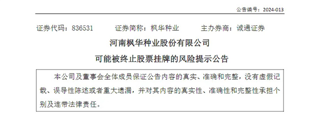 楓華種業:公司股票存在被終止掛牌風險;