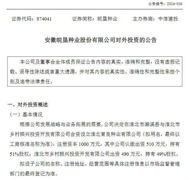 皖墾種業8月8日發布公告稱,根據公司發展戰略與業務拓展的需要,公司決定在淮北市濉溪縣與淮北市鄉村振興投資開發有限公司合資設立淮北育良種業有限公司。