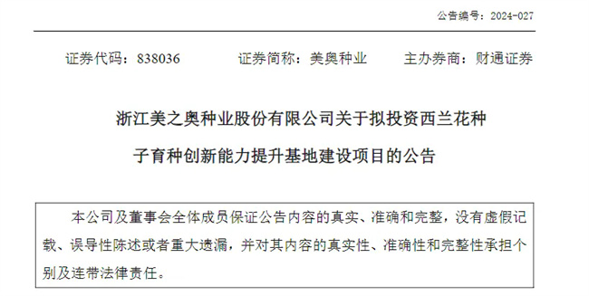 美奧種業:擬投資建立西蘭花育種創新基地,總投資預計不超過3000萬;