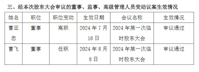 華豐種業發公告稱,公司第三屆董事會第九次會議于2024年8月8日審議并通過:任命曹飛為公司董事長,任職期限自2024年8月8日起至第三屆董事會屆滿之日止,自2024年8月8日起生效。