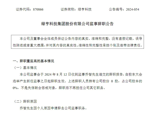 綠亨科技8月12日發布公告稱,監事喬智先生遞交辭職報告。