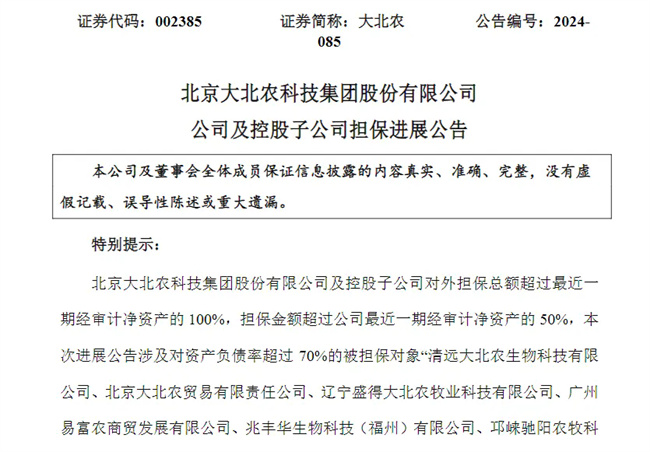 此前,大北農發布公告稱,公司及控股子公司的擔保額度總金額約為182.05億元(含公司及控股子公司之間互相擔保額度預計的160億元)。