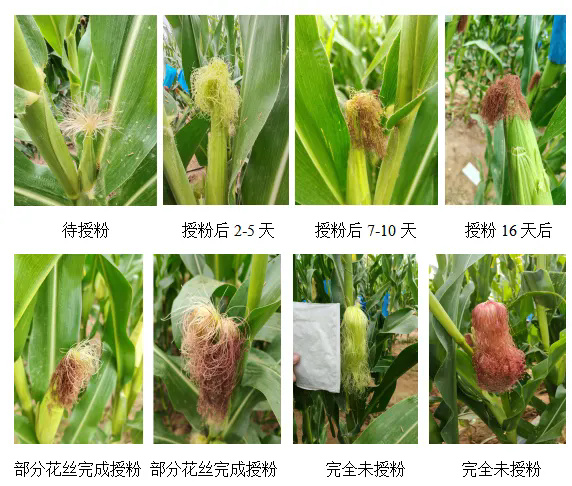 正常條件下,雄穗先抽雄、散粉,雌穗在幾天后,快速完成吐絲和接受花粉。授粉過后2-3天,花絲即與子房外壁分離。因此,當掰開苞葉晃動果穗時,如花絲能大量掉落,說明授粉完成;如花絲仍緊附果穗,說明還未授粉或未能成功授粉。