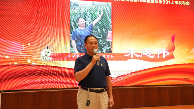 會上,秋樂種業董事長侯傳偉研究員在致辭中指出,作為全國首批育繁推一體化種子企業和全國明星企業,多年來,公司始終秉承科技創新為本,良種培育為先的發展理念,選育高產、高效和抗逆強的品種為基本要求,致力于為農業現代化發展提供堅實的支撐。同時,他表示,此次發布的秋樂991,是公司歷經多年選育的優良品種,不僅符合市場需求,更是在上市之初就贏得經銷商廣泛關注和高度認可。并希望各位合作伙伴以此次活動為契機,加大優良品種推廣力度,為我國糧食安全做出新貢獻!
