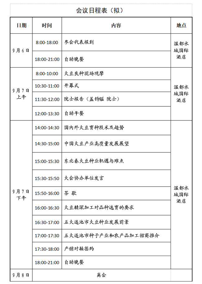 為貫徹落實習近平總書記關于“把種業振興行動切實抓出成效,把當家品種牢牢攥在自己手里”的重大部署,加快高產優質綠色新品種創新,展示大豆品種選育新成果,交流大豆種業振興新進展新經驗,推動大豆全產業鏈高質量發展,中國種子協會、黑龍江省種子協會、五大連池市人民政府,定于2024年9月6-8日在黑龍江五大連池市共同舉辦“第七屆大豆產業高質量發展大會暨五大連池大豆新品種展示會”。現將有關事宜通知下: